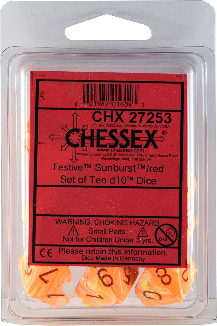 Festive-serien från Chessex är känd för sina unika och livfulla mönster där varje tärning får sitt eget färgspel. Just Sunburst/Red ger ett varmt, solinspirerat utseende som gör dessa tärningar lika dekorativa som funktionella – perfekta för rollspel, brädspel och samlingar.