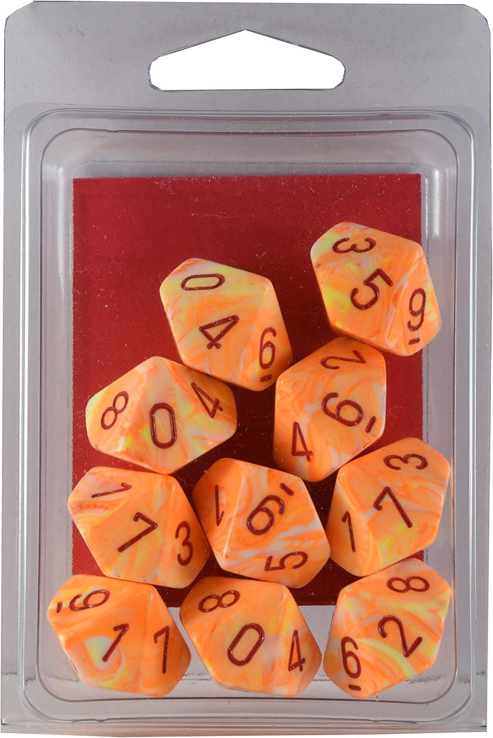 Detta set innehåller 10 st tio-sidiga tärningar (d10) i den färgstarka kombinationen Festive Sunburst/Red med röda siffror. Tärningarna levereras i en praktisk plastförpackning (clamshell).