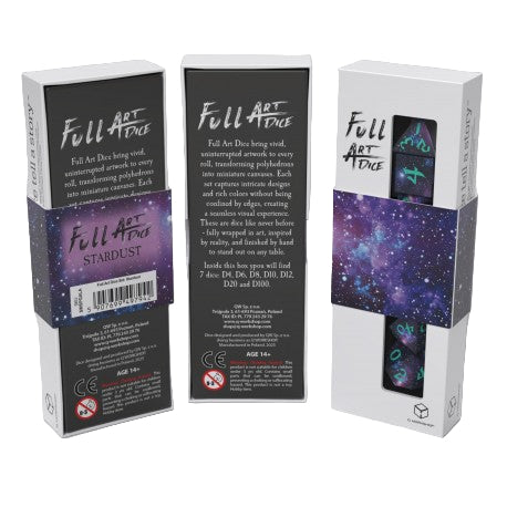 Q Workshop Full Art Dice Nebula är ett exklusivt tärningsset för rollspel som kombinerar funktion och design på högsta nivå. Setet innehåller sju polyhedrala tärningar med realistiska mönster i blå och violetta toner som täcker varje sida – inspirerade av nebulosor och stjärnor i rymden.